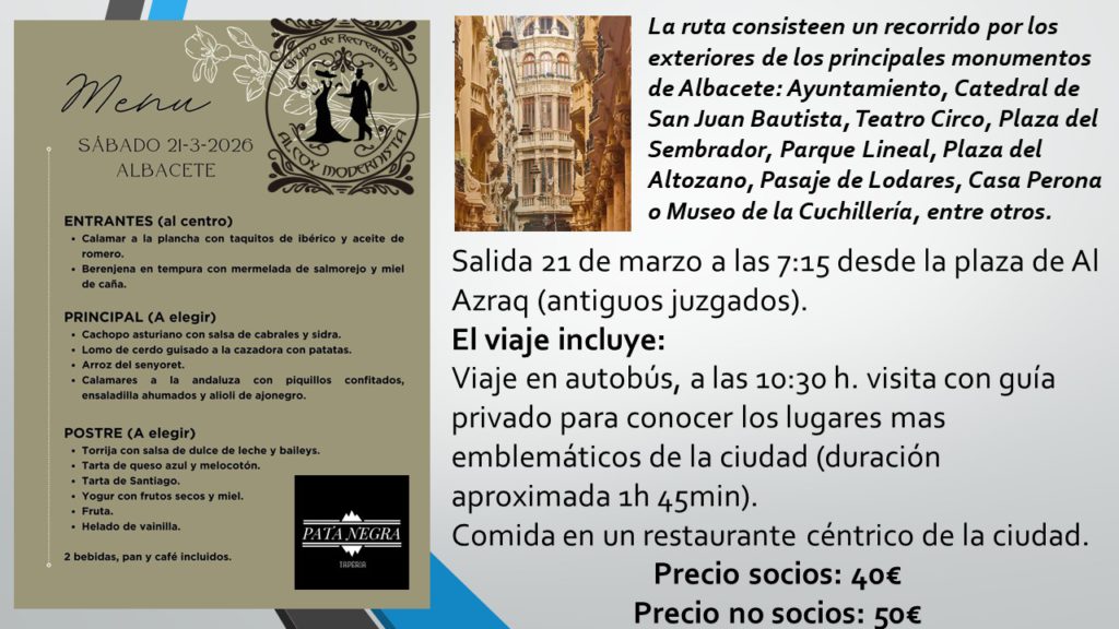 El sábado 23 de octubre de 2021, nuestra asociación se desplazó a Novelda para asistir a su Feria Modernista, realizamos visitas guiadas y tuvimos el privilegio de comer en el espectacular casino modernista de la ciudad.